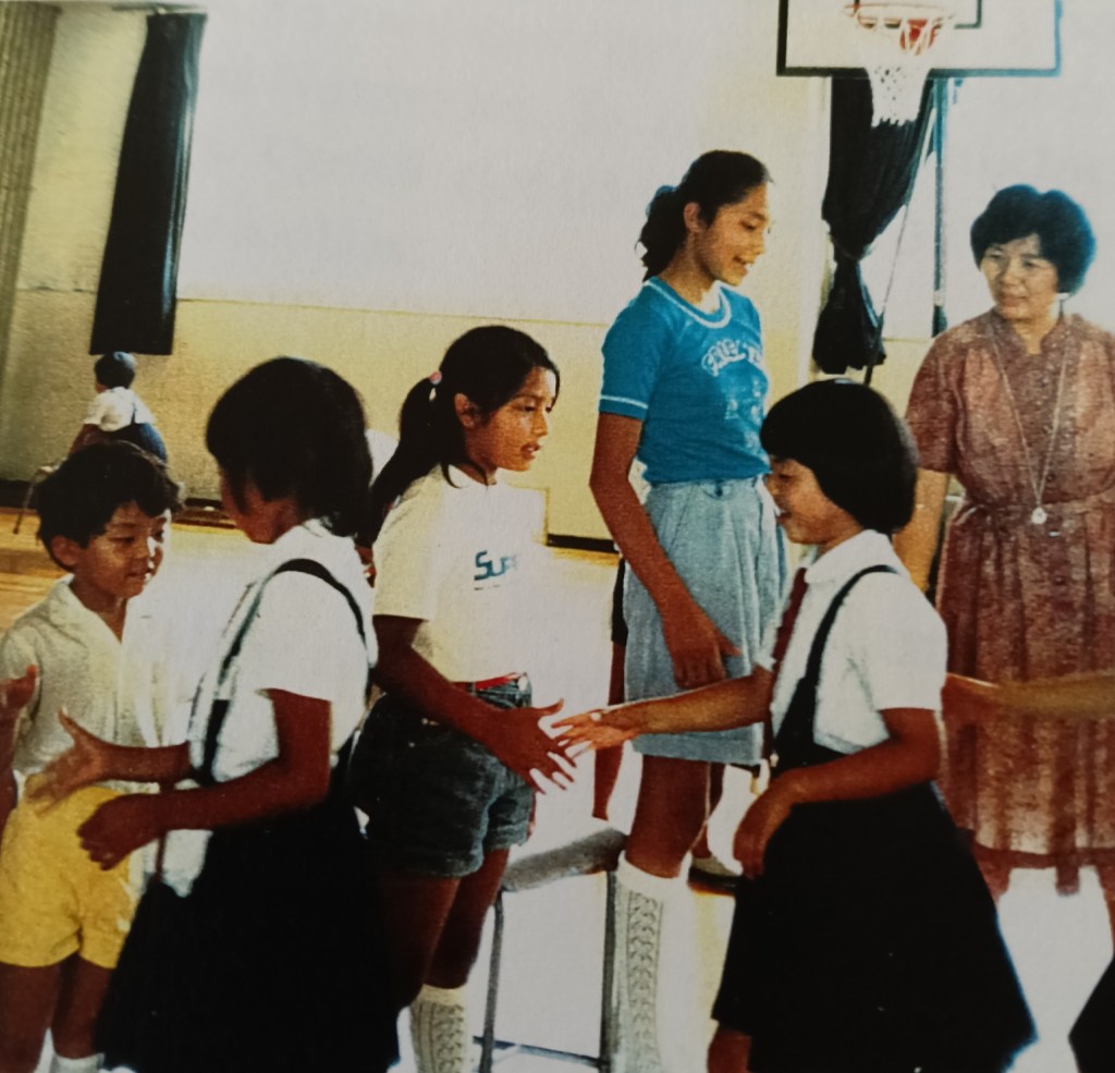 Hace 45 años tuve la oportunidad de asistir a la escuela de verano en Japón. La clase de caligrafía, la clase de dibujo y la clase de natación además de la hora de la comida en la que se juntaban las mesas para compartir todos la hora del almuerzo son los momentos que más se grabaron en mi memoria en cuanto al aspecto escolar. También los bailes que se hacían en rueda, en donde todos los niños giraban en una dirección y las niñas en la dirección opuesta de tal forma que todos bailaban por turnos con cada uno(a) de los(as) compañeros(as) de clase, me hacían sentir un poco de timidez.