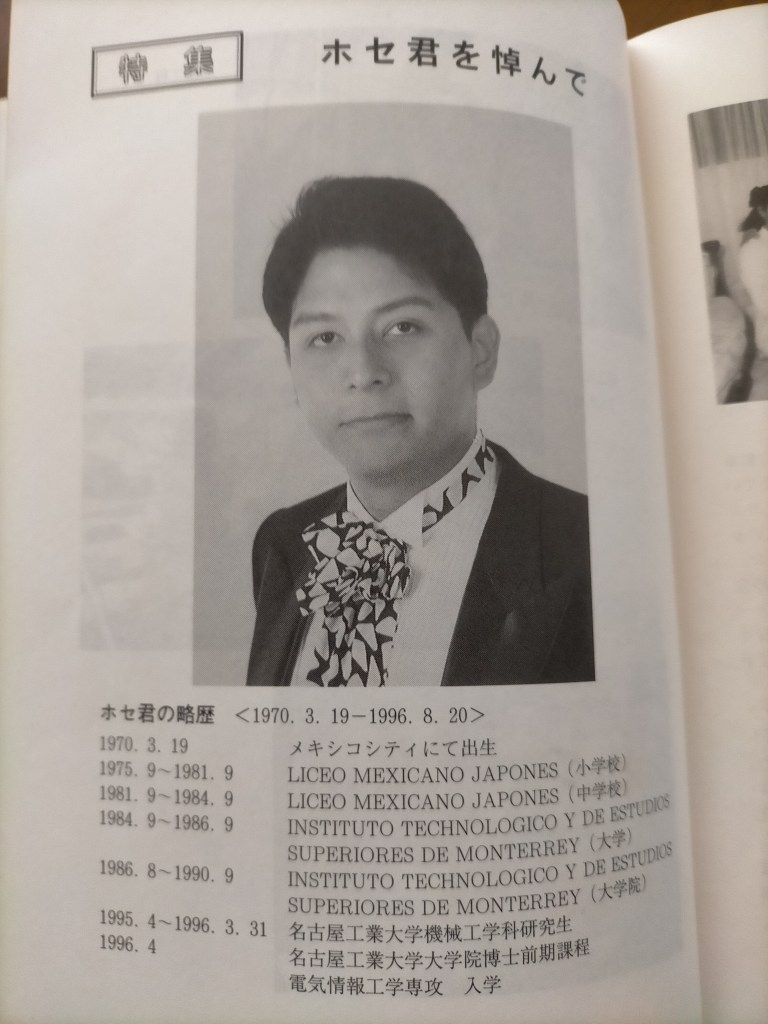 大学を卒業して、日本へ留学しました。名古屋工業大学の研究生として、した最初のプロジェクトは医学に使えるロボットのシステムでした。このロボットは手足の不自由な人の手足となって、働くロボットです。兄の頭の中にはもっといろいろなプロジェクトがあったと思いますが、それをやりとげることは出来ませんでした。二六才の幸せな兄が名古屋でクモ膜下出血で亡くなりました。私は兄のために障害になる門を取り除いてあげることは出来ませんでしたが、兄からいろいろなアドバイスを残してもらいました。今日皆さんと兄からのアドバイスを共有したいと思います。兄のことを知っている皆さんはホセのことを思い出す時悲しいと思うより、兄が皆さんと知り合えたことをとても嬉しく思っていたということを知っていただきたいと思います。