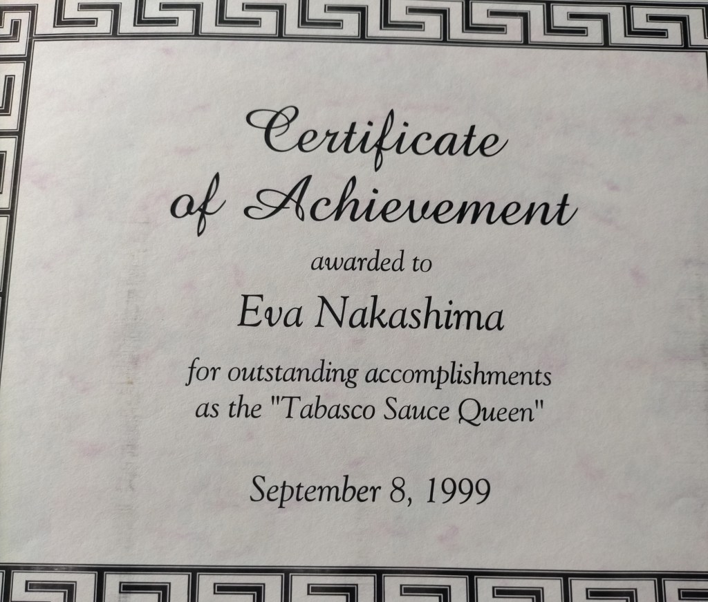 When he called my name he said “The owner of Taco Bell!”. He used to joke with me saying I owned the chain, which is not true of course but a lot of people thought it was true. We had to explain people it was only a joke. Now I was organizing some papers and found a certificate as the “Tabasco Sauce Queen”.